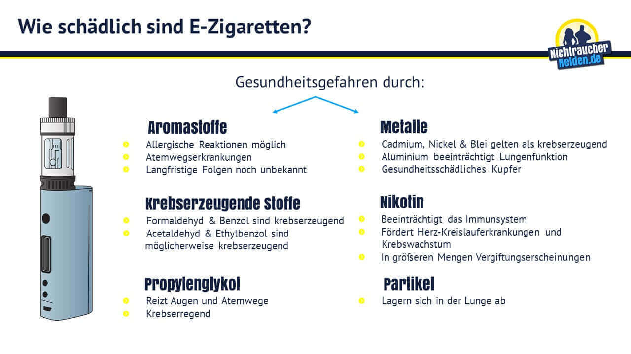 Rüther wie gefährlich oder schädlich ist die E-Zigarette. E-Zigaretten wirken sich in vielfacher schädlich auf den Körper aus. Rüther wie gefährlich oder schädlich ist die E-Zigarette. Ich habe im Internet viel gelesen das es doch schädlich sein sollte und viele Gefahren mit. Habe ich es halt vor muss noch überlegen. Auch in Liquids ohne Nikotin sind Aromen krebserzeugende Stoffe und weitere Substanzen enthalten die der Gesundheit schaden können. Auswirkungen auf die Atemwege.